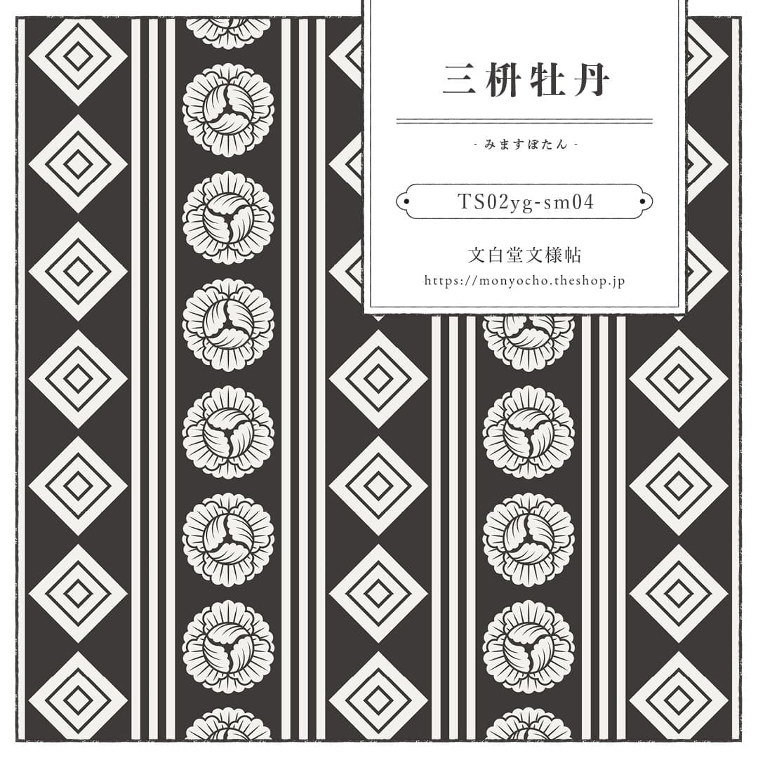 「三枡牡丹(みますぼたん)」は「牡丹に三枡(ぼたんにみます)」ともよばれ、「三ツ入れ枡(みついれます)」と「牡丹(ぼたん)」の花を交互に配した縞文様です。