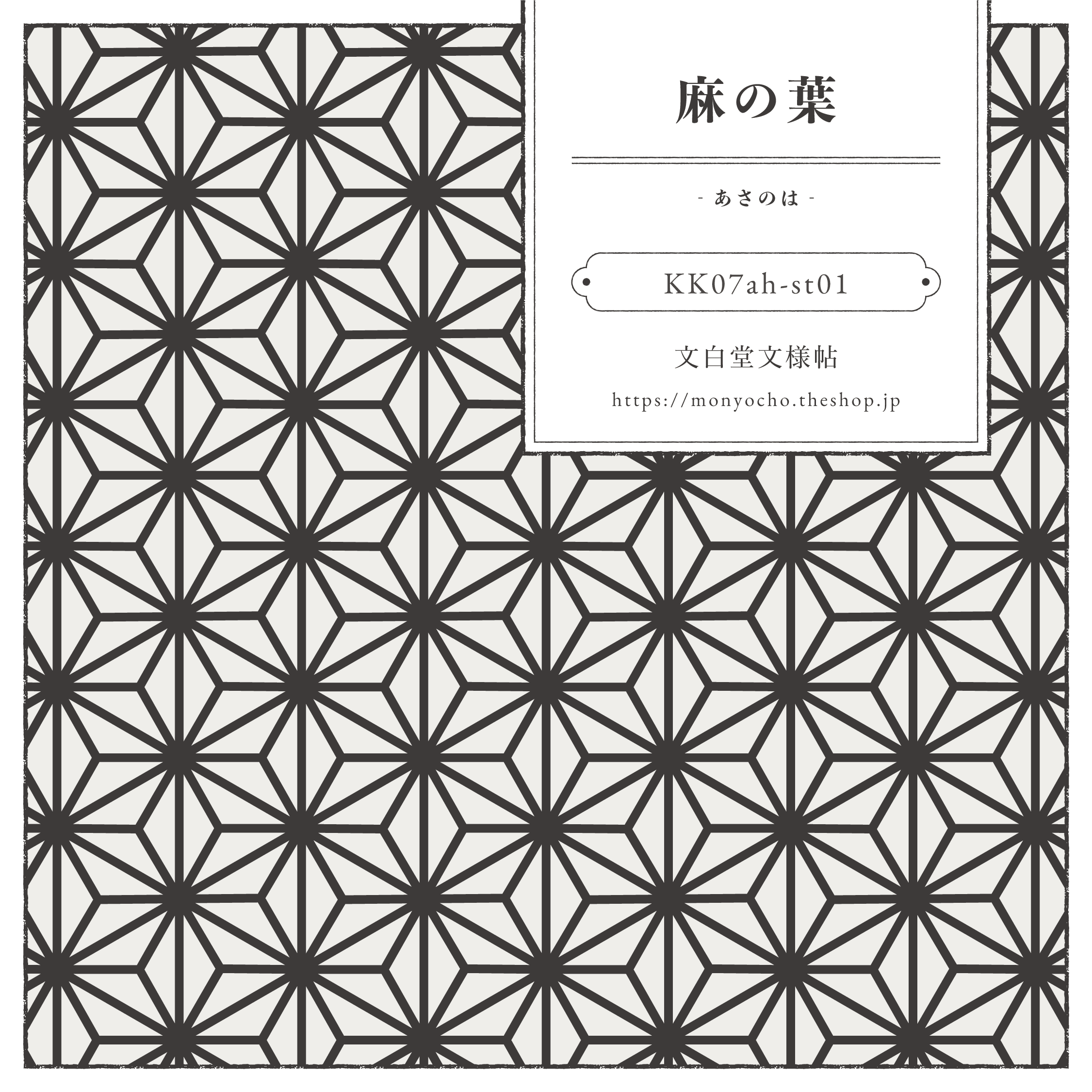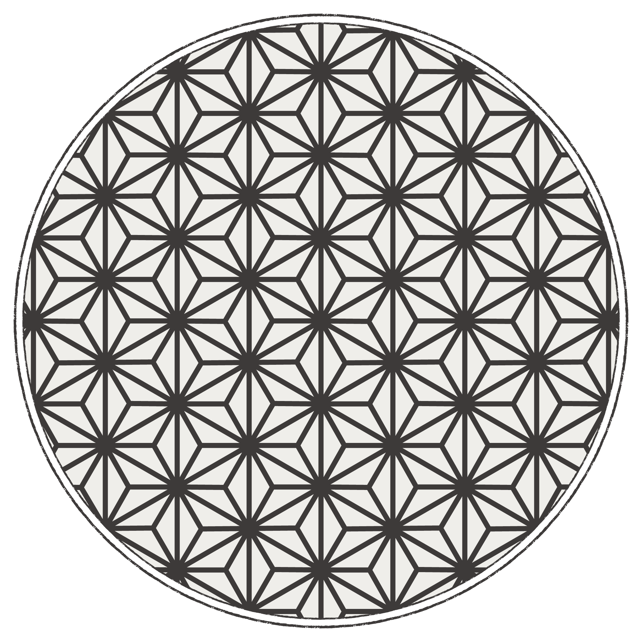 「麻の葉(あさのは)」は幾何構成模様のひとつで、六角形に二等辺三角形を充填させた文様です。