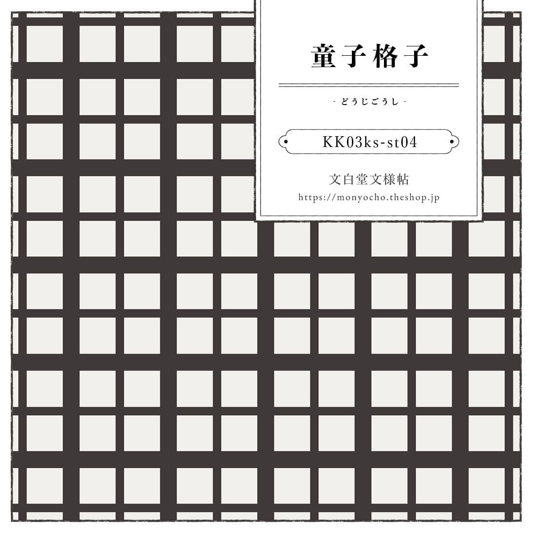 「童子格子(どうじごうし)」は太い格子の中に細い格子を配した格子文様です。「子持ち縞(こもちじま)」を直角に交差させた文様で、芝居の酒呑童子の衣装からこの名がつきました。